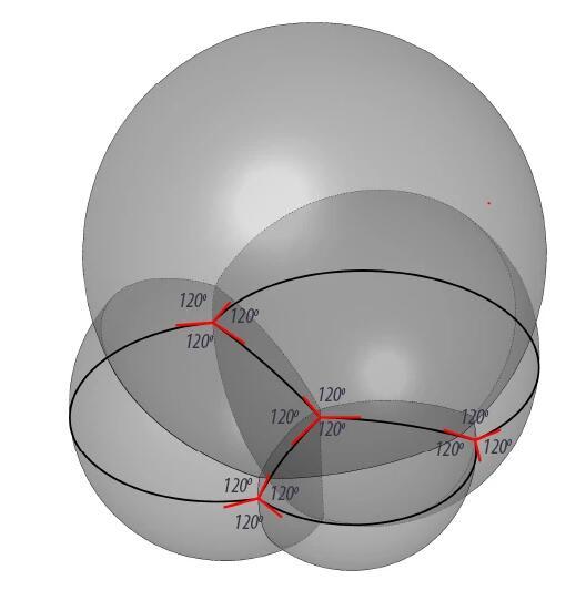 現(xiàn)在我們知道了表面張力決定泡泡的連接方式,泡沫總會(huì)找到一種具有最小表面張力的結(jié)構(gòu),也就是使總表面積最小的結(jié)構(gòu)。但是,關(guān)于泡沫的結(jié)構(gòu)還需要考慮另一個(gè)問題,即力學(xué)上的穩(wěn)定。在連接點(diǎn)處,沿著不同方向的作用力必須達(dá)到平衡。無論是泡泡筏的平鋪還是泡泡堆的四面相連,都是能滿足這一要求的連接方式。