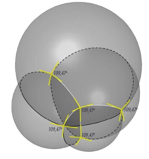 如果我們從平面的泡泡筏推演到立體的“泡泡堆”,結(jié)果也是類似的。假如你用吸管對著一碗肥皂水吹氣,吹起一堆泡沫,你會(huì)看到,當(dāng)泡泡堆積在一起之后,它們四面邊界相交于一個(gè)點(diǎn),夾角約為109°——沒錯(cuò),這個(gè)角度就是正四面體中心到各頂點(diǎn)連線的夾角。