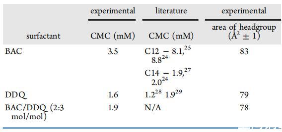 表3:。空氣中BAC、DDQ和BAC/DDQ 2:3 mol/mol的表列CMC和每人頭群表面積值?25°C時的水界面