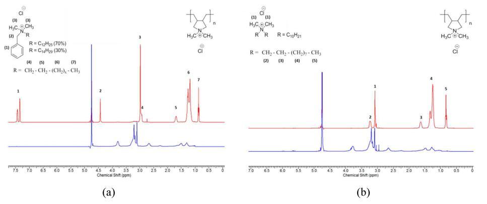 圖3:。樣品頂相和底相的1 H NMR:(a)pDADMAC 8.5 kDa(3 wt%)/BAC(3 wt%)/水樣和(b)pDADMAC 8.5 kDa(3 wt%)/DDQ(3 wt%)/水樣,自上次攪拌后24 H。(紅色)頂相(表面活性劑)和(藍色)底相(pDADMAC)。