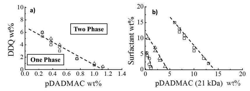 圖4:。(a)pDADMAC/DDQ/水的相分離邊界作為pDADMAC分子量的函數:(□)8.5 kDa(○)21 kDa和(Δ)140 kDa(25°C時)。(b)pDADMAC的相分離邊界(21 kDa)/表面活性劑/水(○)DDQ(□)25°C下的BAC和(Δ)BAC/DDQ(2:3 mol/mol)。虛線表示相界的大致位置。