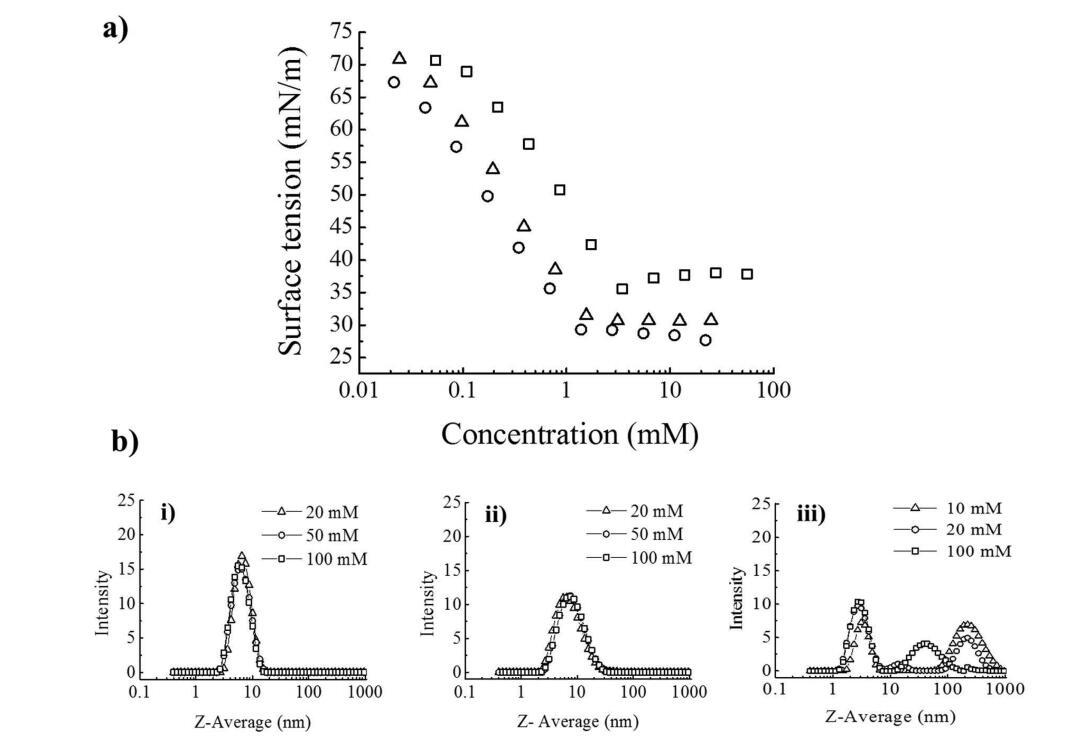 圖1:。(a)25°C水中的表面張力曲線(□)美國銀行(○)DDQ和(Δ)BAC/DDQ(2:3 mol/mol)。(b)25°C下的PCS強度曲線隨濃度變化:(i)BAC(0.3 M NaCl),(ii)BAC/DDQ 2:3 mol/mol(0.05 M NaCl),和(iii)DDQ(5×10?3 M NaCl)。