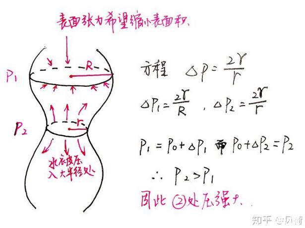 表面張力會像皮筋一樣收縮液體的表面積,同時壓力大(半徑小)的地方的水被擠到半徑大的地方,使得本來細的地方半徑變得更小。