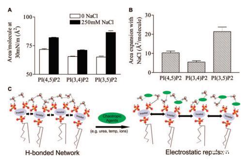 圖5:。亞相氯化鈉膨脹效應(yīng)的PIP2異構(gòu)體特異性。(A)HEPES緩沖亞相上的DO-PIP2異構(gòu)體在π)30 mN/m時(shí)的每分子面積。平均值(SE,n)7。(B)250 mM NaCl和無(wú)亞相NaCl之間DOPIP2異構(gòu)體的每分子面積差異。通過(guò)雙向ANOVA測(cè)量,NaCl效應(yīng)的異構(gòu)體依賴性顯著達(dá)到p)0.0001。(C)PIP2分子間相互作用的概念動(dòng)畫。在沒(méi)有潮向性試劑(綠色橢圓)的情況下,PIP2分子形成水介導(dǎo)的氫鍵網(wǎng)絡(luò)。當(dāng)添加潮向性聚合物時(shí),網(wǎng)絡(luò)被破壞,帶電磷酸鹽之間的靜電排斥導(dǎo)致單層的膨脹。