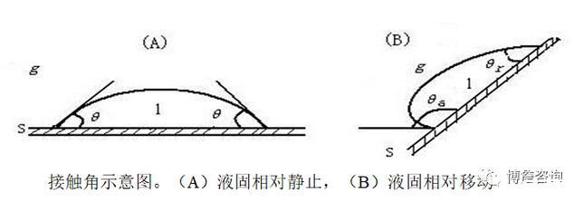 將一液體滴到一平滑均勻的固體表面上,若不鋪展,將形成一平衡液滴,其形狀由固液氣三相交界面處所作氣液界面之切線經(jīng)液滴至固液界面所成之夾角決定,此角稱為該種液體在所研究固體表面上之接觸角,或稱潤濕角。接觸角常以θ表示。