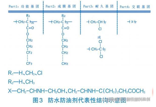如圖3,其代表性結構示意。其中功能基團為含氟防水防油劑的主體,提供防水防油性;成膜基團賦予成膜性、柔軟性;耐久基團可賦予與纖維的接合性(特別是滌綸、尼龍)、耐磨性、耐洗滌性;交聯基團根據自交聯和與纖維的交聯,形成強韌的皮膜后,賦予耐久性等目的。