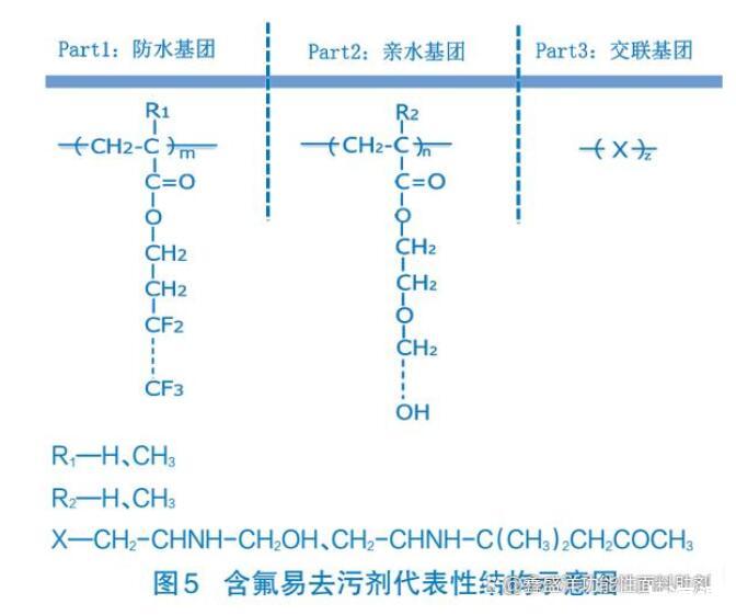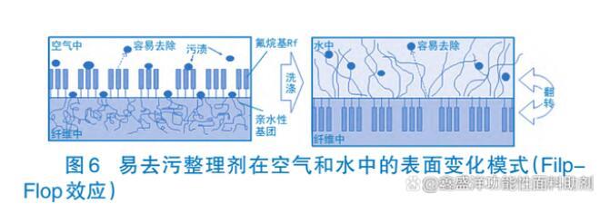 圖5為含氟易去污劑的主要結構含氟易去污整理劑分子中既含有防水防油基團——全氟烷基丙烯酸酯聚合物,又含有親水基團——聚氧乙烯鏈等。織物經整理后全氟烷基鏈段定向排列在纖維表面,排斥水性和油性污物,使其不易沾污。如果織物被污物沾附,在水洗液洗滌時,親水性鏈段定向排列在纖維與液體的界面上,吸引水分子,提高其易去污性能(也叫Filp-Flop,反轉凈洗效應)。織物水洗后烘干,親水鏈段脫水,氟烷鏈段重回其主導地位,再度呈現良好的防水防油性能。