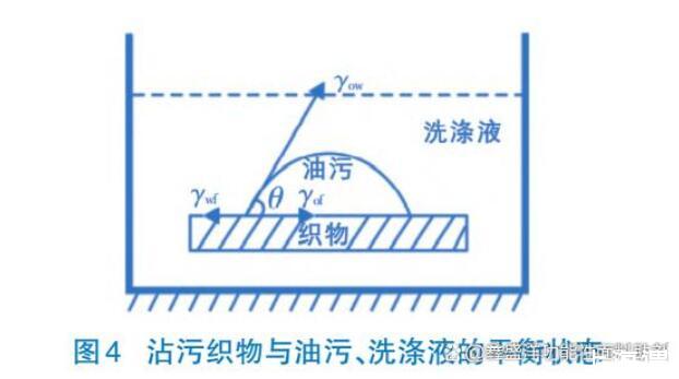 如圖4,從表面化學因素分析,要使油污易去除,紡織品必須有低的γwf(水-織物相的界面張力)和較高的γo(f油-織物相的界面張力),即紡織品必須具有高的親水性能。