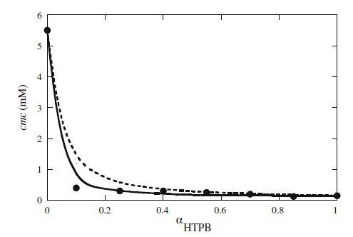 圖2 HTPB+Mega-10混合體系混合臨界膠束濃度(cmc)與αHTPB的關系圖。填充的圓圈表示實驗cmc。虛線表示HTPB+Mega-10混合體系理想行為的相分離模型,而實線最符合RST和βmic 12的數(shù)據(jù)=?3.91