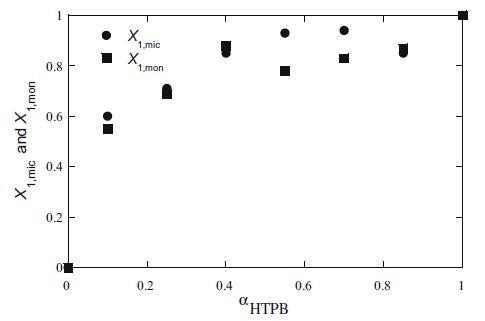 圖3 HTPB+Mega-10混合體系的膠束(X1,mic)和單層(X1,mon)組成與αHTPB的關系圖