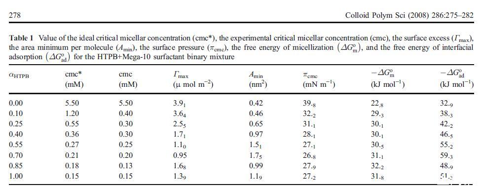 其中N是阿伏伽德羅數(shù)。表1中列出了HTPB和Mega-10混合系統(tǒng)的最大值和最小值。純Mega-十的最大值與報告值一致[3]。Mega-10的Γmax值高于HTPB。這種行為表明兩親性Mega-10比HTPB排列得更緊湊。這是由于存在導致靜電排斥的電荷,以及HTPB分子中存在體積龐大的三苯基,導致空間位阻,防止HTPB分子在界面處緊密堆積。二元混合物的Γmax隨著HTPB摩爾分數(shù)的增加而減小。這種效應可以認為是由于HTPB離子頭基團的靜電排斥或空氣-水界面存在熱運動導致單層不穩(wěn)定。另一方面,Amin值明顯顯示相反的行為,如等式3。