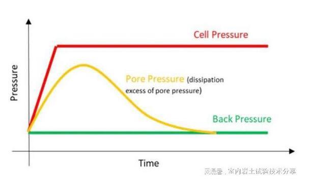 飽和后,試樣通常被固結到代表其原位條件的應力狀態。固結通常是各向同性的應力-垂直和水平施加給樣品的應力相同(σ3=σ1)。然而,固結也可以是各向異性的,其中σ3≠σ1。在這種情況下,測試通??s寫為CIU(各向同性固結不排水)或CAU(各向異性固結不排水)。試樣固結通常通過增加圍壓進行,同時保持恒定的反壓(通常等于最終飽和度B檢測期間達到的孔隙壓力)。