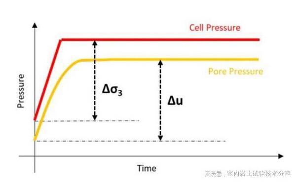 在此過程中,計算孔隙壓力系數B以確定飽和度。重復這些步驟,直到樣品飽和。大多數標準規定,大于0.95的B值表明標本已充分飽和。B值計算為一個比值其中?u=孔壓變化?σ3=圍壓變化;