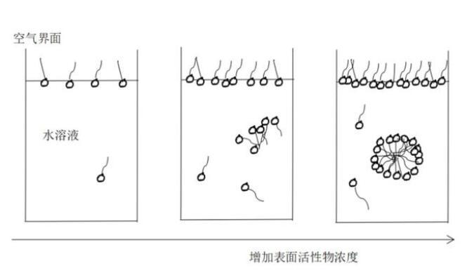 我們?cè)谖恼麻_(kāi)頭介紹過(guò),表面活性劑是一種兩親的分子,一頭親水一頭親油。因此,低濃度時(shí)表面活性劑傾向于留在水的表面,親油(厭水)的一頭朝外,首先布滿水面,也就是水-空氣界面,所以會(huì)降低這個(gè)界面的張力。