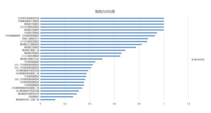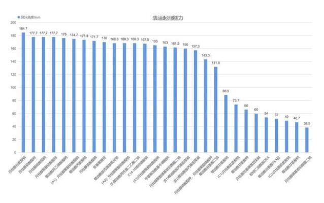 通過(guò)對(duì)比和排序,我們很快就能篩選出起泡能力好的表活劑,同時(shí)也能得到表活劑的起泡規(guī)律:(ps:由于相同原料出于不同廠商,其泡沫性能也存在差異,此處用不同大寫(xiě)字母代表不同的原料廠商)