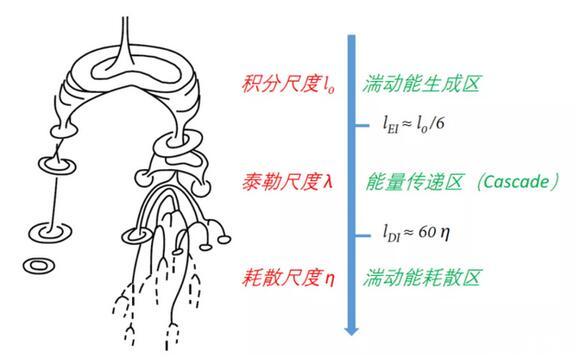 而之所以會出現上圖中的有趣現象,則要牽扯到湍流的生成、傳遞及耗散:湍流中的大渦會破碎為小渦,小渦再破碎為更小的“迷你渦”,然后逐漸耗散,這個過程與當地雷諾數相關。當“迷你渦”變得足夠小時,根據角動量守恒,渦的角速度將會非常大,意味著局部速度剪切很強,粘性就變得舉足輕重了,于是,“迷你渦”就這樣被粘性耗散掉了。事實上,渦的尺度足夠小時,體現為當地雷諾數非常小,粘性力對流體的影響則顯著大于慣性力。
