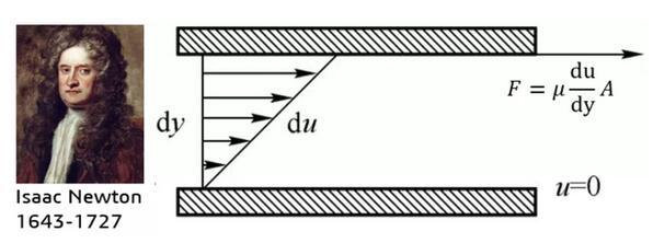 正如前面所說,人們很早便感受到了流體具有“粘”的屬性,但是如何從科學上表達流體的粘性成為了一個新的問題。作為世界物理學界金字塔尖的男人,牛頓幾乎霸屏了整個中學物理課本,當然也沒有放過流體。1686年,牛頓經過大量的實驗研究,提出了著名的“內摩擦定律”——流體的內摩擦力(即粘性力)的大小與流體的性質(粘性系數μ)有關,并與流體的速度梯度和接觸面積成正比。