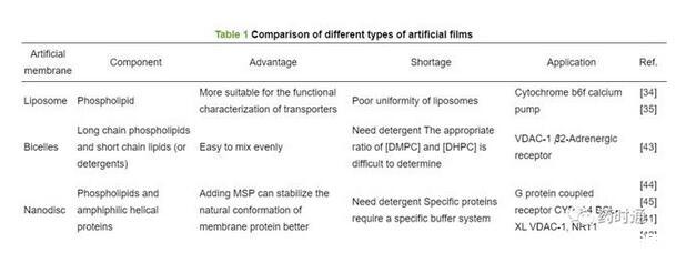 與雙胞體一樣,納米盤的第一步是基于洗滌劑的增溶,需要優(yōu)化所使用的洗滌劑的性質(zhì)和濃度,這在納米盤重組中可能造成蛋白質(zhì)活性損失,因此同樣存在洗滌劑使用相關(guān)問題的限制。表1[34,35,41-45]比較了脂質(zhì)體、雙胞體、納米盤的組成及其優(yōu)缺點。
