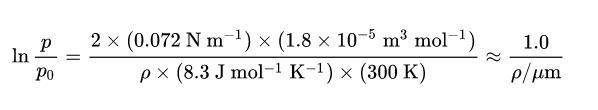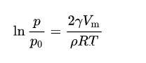 聽說公式會讓人不想看科普所以我只講這一個公式好了(x)其中,R是通用氣體常量,T是溫度,ρ是液滴表面的曲率半徑。p?是表面平整的液體原本的蒸氣壓,p是這個液滴的蒸氣壓。p?、表面張力γ、液體摩爾體積V_m對于同種溫度的同種液體可以認為近似是常量。把以上常量合并為常量C,所以在同樣溫度下,對于同種液體,可以得出如下的半定量關系: