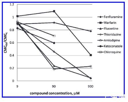 圖4.CMC移位(通過將藥物-脂質(zhì)復(fù)合物(DL的CMC之間的比率表示)和單獨的脂質(zhì)(L)的CMC:CMC測試化合物與二FF erent科幻最終在濃度樣品孔在pH7.2。
