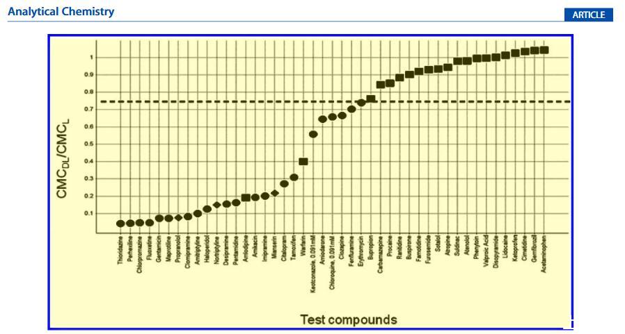 濃度依賴性。體內(nèi)研究中PLD的程度是劑量依賴性的。24,33在體外試驗中,濃度控制可用于估計劑量依賴性。一組七種報告的PLD誘導(dǎo)劑分別以三種不同的濃度進行了測試:910、91和9.1μM(圖4)。對于氯喹和酮康唑,要么它們在10 mM時不能完全溶解在DMSO中,要么在使用10 mM DMSO儲備液時與緩沖液混合后鹽析出來,它們的最高濃度點被去除。所有化合物都表現(xiàn)出對CMC的濃度依賴性,以不同程度改變PLD誘導(dǎo)潛力。即使在910μM時,芬氟拉明似乎也是一種弱誘導(dǎo)劑,而硫利達嗪在不同濃度之間顯示出顯著變化。根據(jù)該體外數(shù)據(jù),在9.1μM的最低濃度下,七種化合物中沒有一種似乎能夠誘導(dǎo)PLD。復(fù)合自聚合。與磷脂類似,大多數(shù)PLD誘導(dǎo)劑是兩親性的。盡管帶有不同的電荷跡象,但它們也可以聚集并形成膠束。拉貝洛爾20,34和奎尼丁35被報道為PLD誘導(dǎo)劑;然而,在所應(yīng)用的測試條件下,我們無法確定任何一種藥物脂質(zhì)復(fù)合物的CMC。獲得的RFU值等于或低于空白(含熒光探針但不含脂質(zhì)的化合物)中的值。進一步研究了不同藥物濃度但沒有脂質(zhì)(0 mg/mL脂質(zhì)),并且在無脂質(zhì)測定緩沖液中,拉貝洛爾和奎寧的CMC值分別為26和20μM。這些CMC值遠低于這些化合物在PLD篩選中的測試濃度,并且懷疑化合物的自聚集會干擾藥物脂質(zhì)復(fù)合物形成的檢測,從而使CMCDL無法確定。