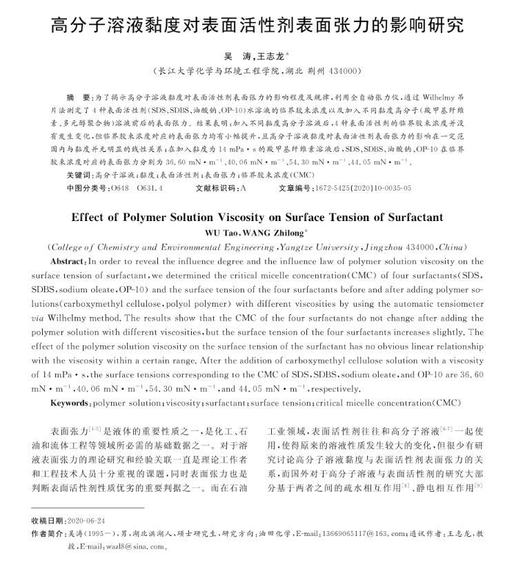 高分子溶液黏度對表面活性劑表面張力的影響研究