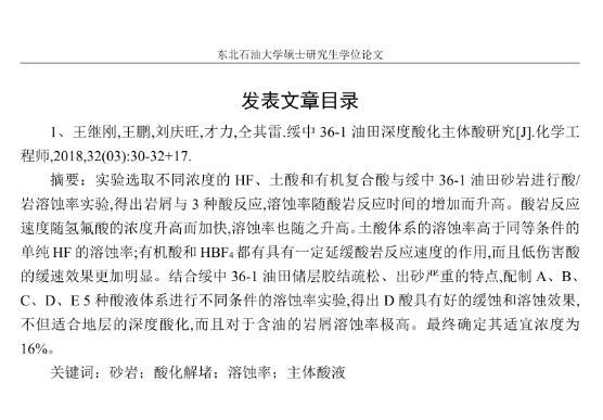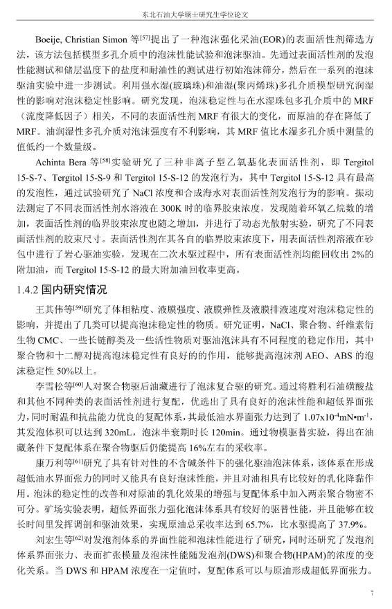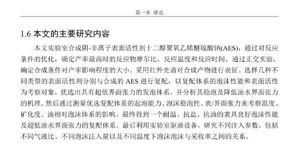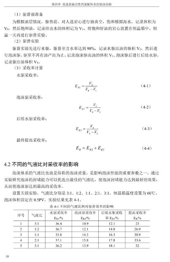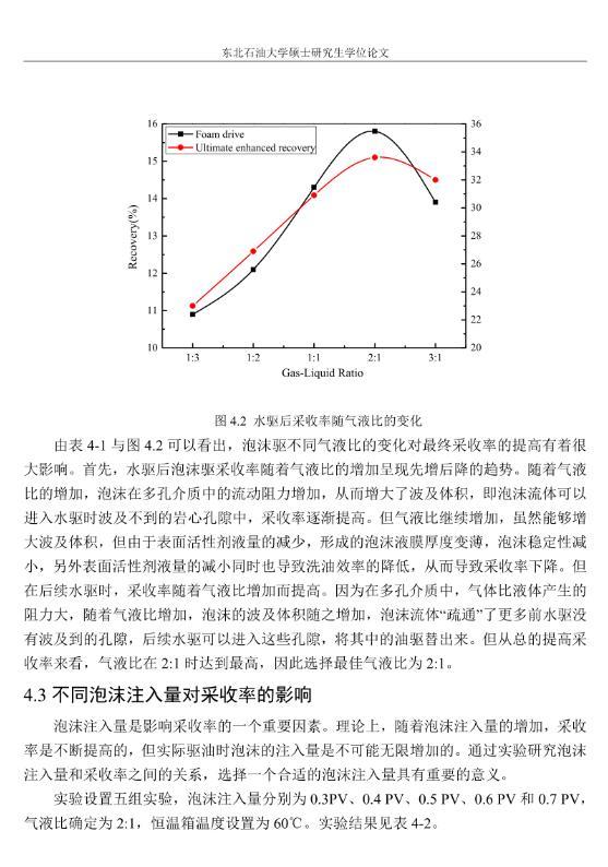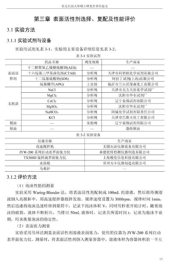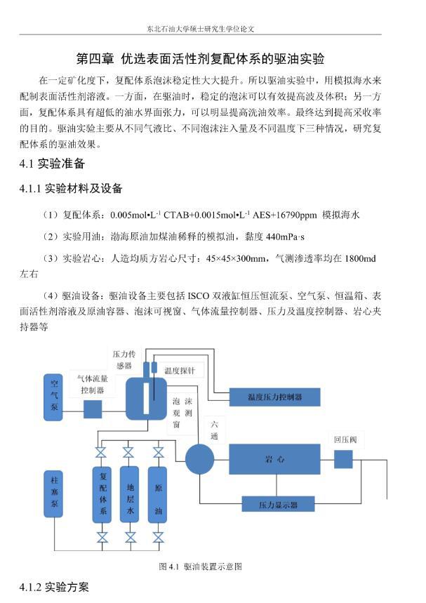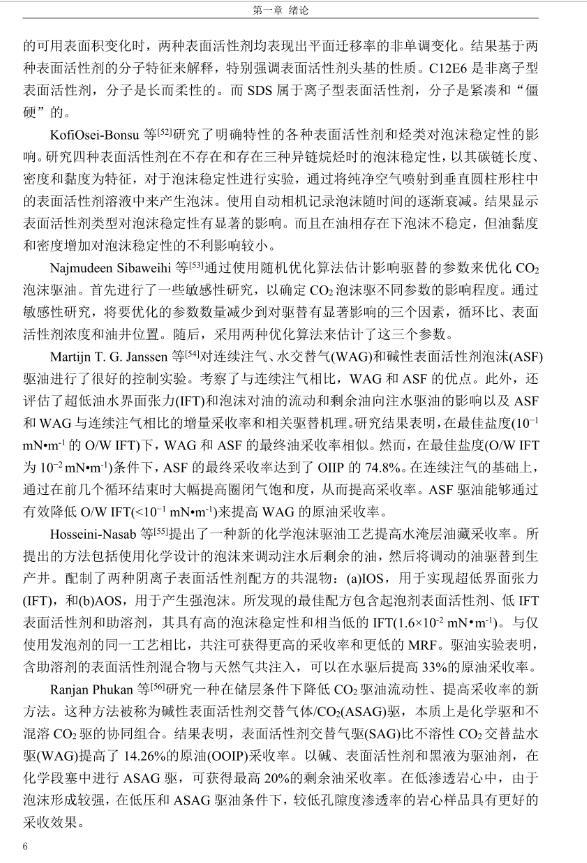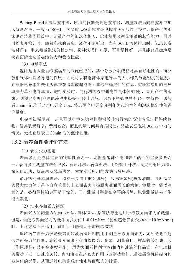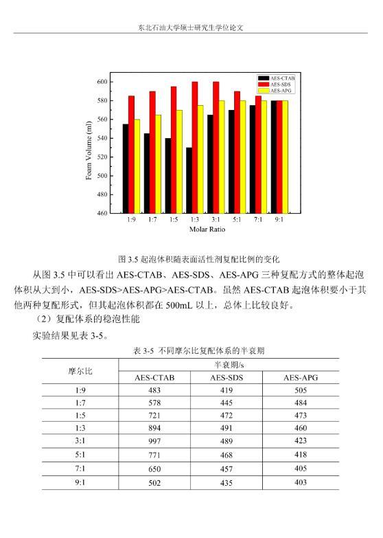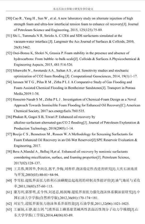 【摘要】:泡沫驅(qū)具有良好的驅(qū)油性能,在提高采收率方面?zhèn)涫荜P(guān)注。在泡沫驅(qū)油過(guò)程中,能夠明顯降低注入流體的流度,改善流度比,降低流體的相對(duì)滲透率,延緩注入流體的突破時(shí)間,封堵高滲層的大孔道,改變液流的方向,較好地實(shí)現(xiàn)封堵作用。但泡沫作為一種熱力學(xué)不穩(wěn)定流體,其穩(wěn)定性受許多因素的影響,包括遇油快速消泡、在高溫和高礦化度的情況下極易破裂等,泡沫穩(wěn)定性已成為泡沫驅(qū)油時(shí)亟待解決的問(wèn)題。另外,用于泡沫驅(qū)的泡沫體系很難兼具超低界面張力和穩(wěn)定泡沫兩種性能,而且文獻(xiàn)報(bào)道對(duì)這方面的研究較少,這為本文提供了一個(gè)新的思路。實(shí)驗(yàn)室合成陰-非離子型表面活性劑十二醇聚氧乙烯醚硫酸鈉(AES)。AES同時(shí)具有陰離子和非離子兩種表面活性劑的性能,具有很好的泡沫性能和表面活性,同時(shí)與其它表面活性劑具有很好的相容性。最終確定的合成條件為:十二醇聚氧乙烯醚和氨基磺酸的摩爾比為1:2,反應(yīng)溫度為95℃,反應(yīng)時(shí)間為60min。在合成AES的基礎(chǔ)上,選擇幾種不同類型的表面活性劑進(jìn)行復(fù)配,優(yōu)選出泡沫性能和表面活性優(yōu)良的體系,進(jìn)行耐溫、耐礦化度及耐油性能的評(píng)價(jià)。實(shí)驗(yàn)采用Waring-Blender法測(cè)量泡沫的起泡體積和半衰期,采用吊環(huán)法和旋轉(zhuǎn)滴法測(cè)量復(fù)配體系的表面張力與油水界面張力。實(shí)驗(yàn)最終優(yōu)選出泡沫性能與表面活性優(yōu)良的AES-CTAB復(fù)配體系,并確定其最佳復(fù)配摩爾比為3:1,最佳總濃度為0.02mol·L-1。復(fù)配體系耐溫200℃,耐質(zhì)量分?jǐn)?shù)20%的原油,礦化度增加可以提高復(fù)配體系的泡沫穩(wěn)定性和表面活性。實(shí)驗(yàn)從氣液比、泡沫注入量和溫度三個(gè)方面對(duì)泡沫提高采收率的影響進(jìn)行研究。最佳氣液比為2:1,最佳泡沫注入量為0.6PV,泡沫采收率隨溫度的提高逐漸下降,在60-100℃范圍內(nèi)泡沫在水驅(qū)后提高采收率在30%以上。
