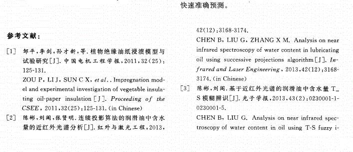 【摘要】:為了有效監(jiān)控絕緣油的運行狀態(tài),采用定量分析方法探討了微量水分對絕緣油表面張力的影響規(guī)律。通過配制不同微水含量的絕緣油樣,對每組油樣進(jìn)行表面張力測試,然后對油樣進(jìn)行紅外光譜掃描,獲取了油樣中水分在特征波數(shù)處(1 640,3 400,3 450,3 615cm-1)的吸光度值。分析了油液中2,6-二叔丁基對甲酚(T501)等添加劑對油樣表面張力變化規(guī)律的影響。結(jié)果表明:油樣中水分含量與水分特征吸光度值之間有較好的相關(guān)性(相關(guān)系數(shù)分別為0.964 1,0.984 8,0.984 5,0.944 0),油樣表面張力和1 640,3 400,3 450,3 615,3 650cm-1波數(shù)處油樣吸光度值的變化亦均呈現(xiàn)良好的正相關(guān)性。建立了油樣表面張力與特征波數(shù)處油樣吸光度值的多元線性回歸模型,擬合精度為0.992 8;根據(jù)模型得到的表面張力計算值與實際測量值誤差為-0.07~0.06%,吻合性較好。文中的實驗可為含微水絕緣油的表面張力檢測提供理論支撐。