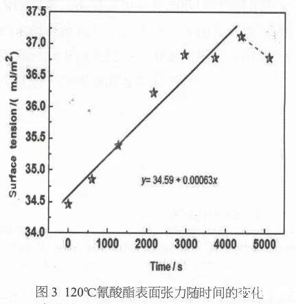 從圖3中,我們可以看到含固化劑的氰酸酯樹脂體系在恒溫溫度120℃下表面張力變化關系為線性增加段和表面張力突降段。