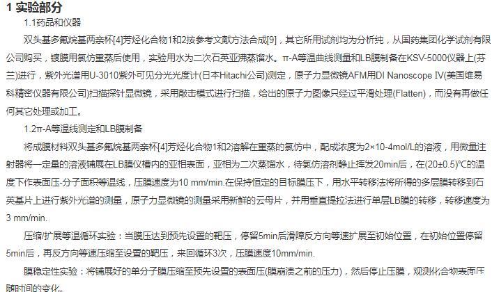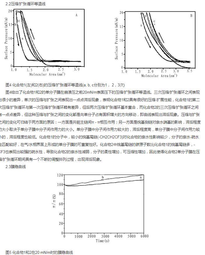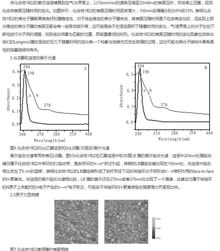 合成了雙頭基多氟烷基兩親杯芳烴化合物1和2,并對該化合物在空氣/水相界面的成膜性能進行了研究,利用表面壓一面積(π-A)等溫線、壓縮/擴張循環等溫線與膜穩曲線,紫外光譜和原子力顯微鏡對組裝的LB膜進行了結構表征,表明化合物1和2在空氣/水相表面均能很好的形成穩定的Langmuir膜,取代基碳原子數的增加使得化合物2的Langmuir膜單分子面積增加,崩潰壓相應減少,組裝的LB膜均為H-聚集體,結構均勻,穩定性好。