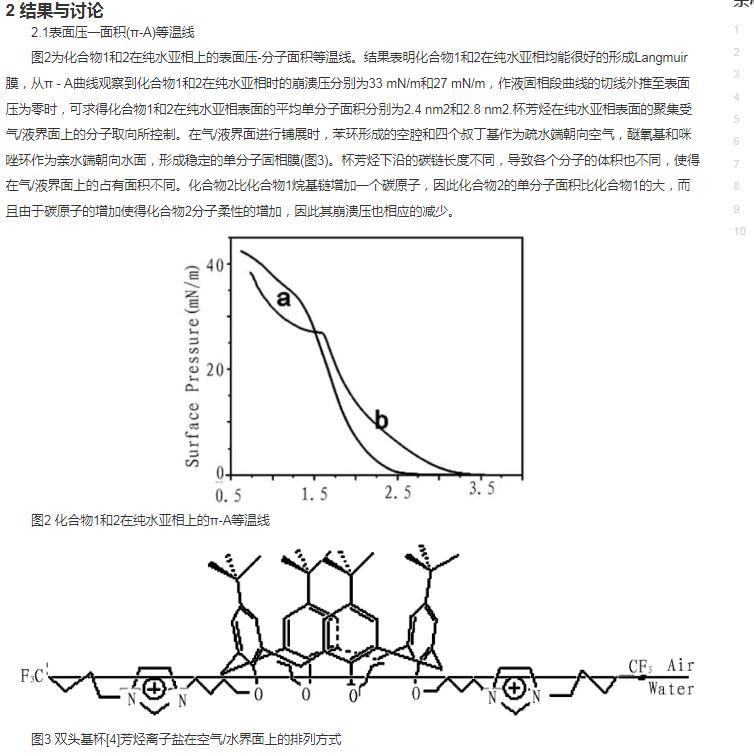 Langmuir-Blodgett膜技術(LB膜)是一種精確控制薄膜厚度和分子排列的單分子膜沉積技術,即在水氣界面上能將成膜材料分子加以緊密有序地排列,形成單分子層,然后再轉移到固體襯底上的制膜技術,利用該技術可以將功能化合物的光學、電磁學、分子識別與催化等性質轉移到膜材料中。杯芳烴是繼環糊精、冠醚之后出現的第三代超分子主體分子,它具有空腔可調節,構象可變換,并易于化學改性和修飾等特點,特別是對它進行適當修飾以后的化合物在材料化學,配位化學,生物化學等領域表現出潛在的應用前景與研究價值。基于上述認識最近我們合成了雙頭基多氟烷基兩親杯芳烴化合物1和2(圖1),并對該化合物在空氣/水相界面的成膜性能以及LB膜的結構進行了研究。