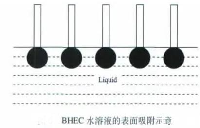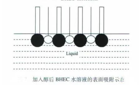 乙醇和正丁醇屬于一元醇,這兩種醇的加入能使BHEC水溶液的表面張力減小。當未加入一元醇時,BHEC溶于水后,BHEC分子能自發(fā)地吸附在溶液的表面,使溶液的表面張力降低,表面吸附的BHEC分子越多,溶液表面張力的降幅越大,當然這其中有一個吸附飽和的問題。但由于BHEC分子在水中處于空間交聯(lián)網(wǎng)絡結構,其定向排列時分子間存在一定的空間(見上圖)。加入乙醇或正丁醇后,醇分子可以插入BHEC分子間的空隙,使溶液表面吸附的分子達到緊密排列的狀態(tài)(見下圖),導致BHEC水溶液的表面張力繼續(xù)降低。