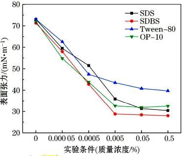 (1)表面張力的研究結果表明,溶液的表面張力均隨著表面活性劑質量分數的增大呈現降低的趨勢;當表面活性劑質量分數達到CMC后,溶液的表面張力不會再因為濃度而明顯下降;所選試劑中非離子表面活性劑SDBS在減小表面張力的效率和效能方面最優。