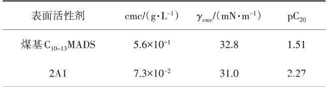 由表1可以看出,2A1的cmc低于C10~13MADS,即形成膠束的能力更強,這是由于2A1的親水性低于C10~13MADS,疏水作用強,有利于形成膠束。2A1的pC20值大于煤基C10~13MADS,說明2A1在去離子水溶液中降低溶液表面張力的效率高于C10~13MADS。對于碳?xì)滏溞捅砻婊钚詣瑲?液界面處的—CH3密度對其表面活性起著很重要的作用,—CH3密度的增大有利于溶液表面張力的降低,同時γcmc值也逐步降低。由表1可以看出,煤基C10~13MADS的γcmc大于2A1,這是由于2A1是采用四聚丙烯得到的支鏈?zhǔn)樵现苽涞模涫杷湹摹狢H3密度大于煤基C10~13MADS。