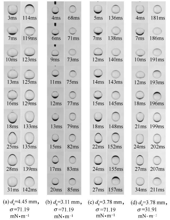 液滴運(yùn)動過程中的形狀變化對液滴的蒸發(fā)、燃燒等過程有重要影響,表面張力是影響其形狀變化的因素之一。為研究表面張力對液滴形變的影響規(guī)律,采用低濃度的表面活性劑(十二烷基苯磺酸鈉SDBS)配制表面張力為30~72 mN·m?1的水溶液。利用不同外徑的針管得到3~5 mm粒徑的液滴。高速攝像機(jī)(Phantom V211,1000 pps,800×600 pixel)對這些液滴在自由落體過程中的形變規(guī)律進(jìn)行了可視化實驗研究,得到了關(guān)于E?tv?s數(shù)(Eo)的半經(jīng)驗關(guān)系式。實驗結(jié)果表明,液滴在自由落體過程中會形成周期性振動形變,振動周期和振幅隨表面張力增大而減小。進(jìn)一步研究發(fā)現(xiàn),初始時液滴形成并斷裂所引起的瞬態(tài)沖量使液滴內(nèi)部動量傳遞進(jìn)而表現(xiàn)出周期性振動形變。