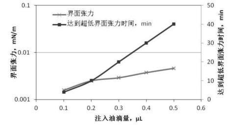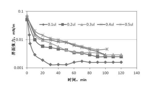 圖3、圖4是根據前述實驗步驟1、2提供的配置與測量方法,油滴注入量分別為0.1μL、0.2μL、0.3μL、0.4μL、0.5μL,無堿二元驅配方體系與高凝油間界面張力的關系曲線。從圖2可知:無堿二元驅配方體系與高凝油間的界面張力達到超低界面張力的時間隨著油滴注入量的增多明顯延長,注入油滴0.1μL,4分鐘達到超低界面張力,注入油滴0.5μL,40分鐘達到超低界面張力;從圖4可知:注入油滴量大于0.3μL以后,對無堿二元驅配方體系與高凝油間界面張力的測定不能持續2小時,油滴在100分鐘發生斷開,對于高凝油而言,油滴注入量小于0.3μL較適合。