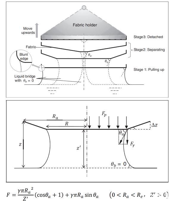 基于液體表面張力的理論模型從濕態貼附現象的成因出發進行構建,可預測分離過程第二階段(逐漸分離階段)中各種織物與液體之間的貼附力。